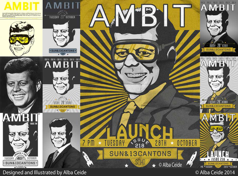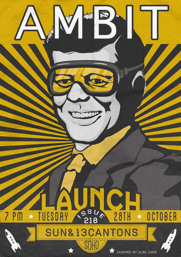 Promotinal poster for the launch of the issue 218 of AMBIT magazine. The event is on 28th October 2014 in Sun&13Cantons (Soho, London).