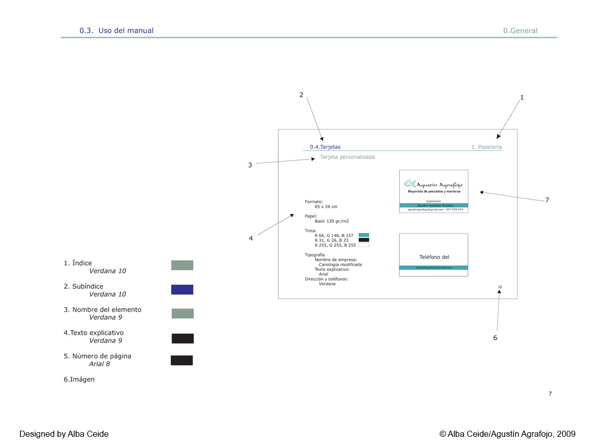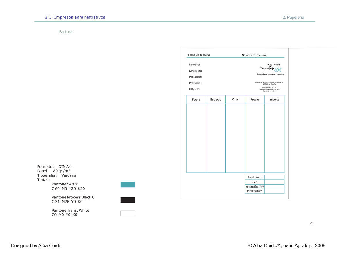 The seafood exporter 'Agrafojo Augustine' is based in A Coruña (Spain). I had to redesign the corporate image so I developed a manual where I detailed the mobile park, signage, costumes, stationery, gifts... Here you can see some of the pages of the manual.