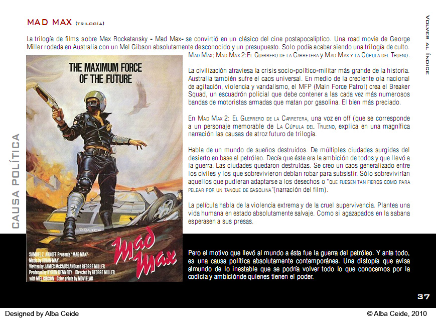 The essay 'The Earth: Hell from another planet' examines the socio-political dystopia in the figurative narration of the twentieth century. I included several films and some graphic novels to show the evolution and diversity of the genre. I started from the three masterpieces of the golden age of science fiction from where I began a classification that covers the dystopia like five different objects to study.