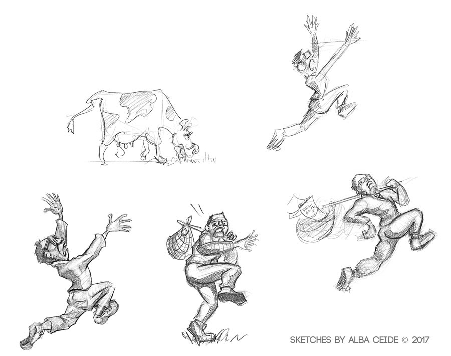Below, some of the sketches I did to design the main character and the "frightening" cow.